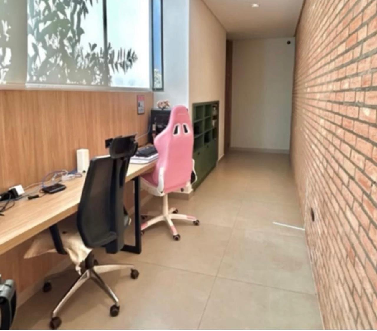 Corredor com bancada planejada, ideal para escritório ou home office