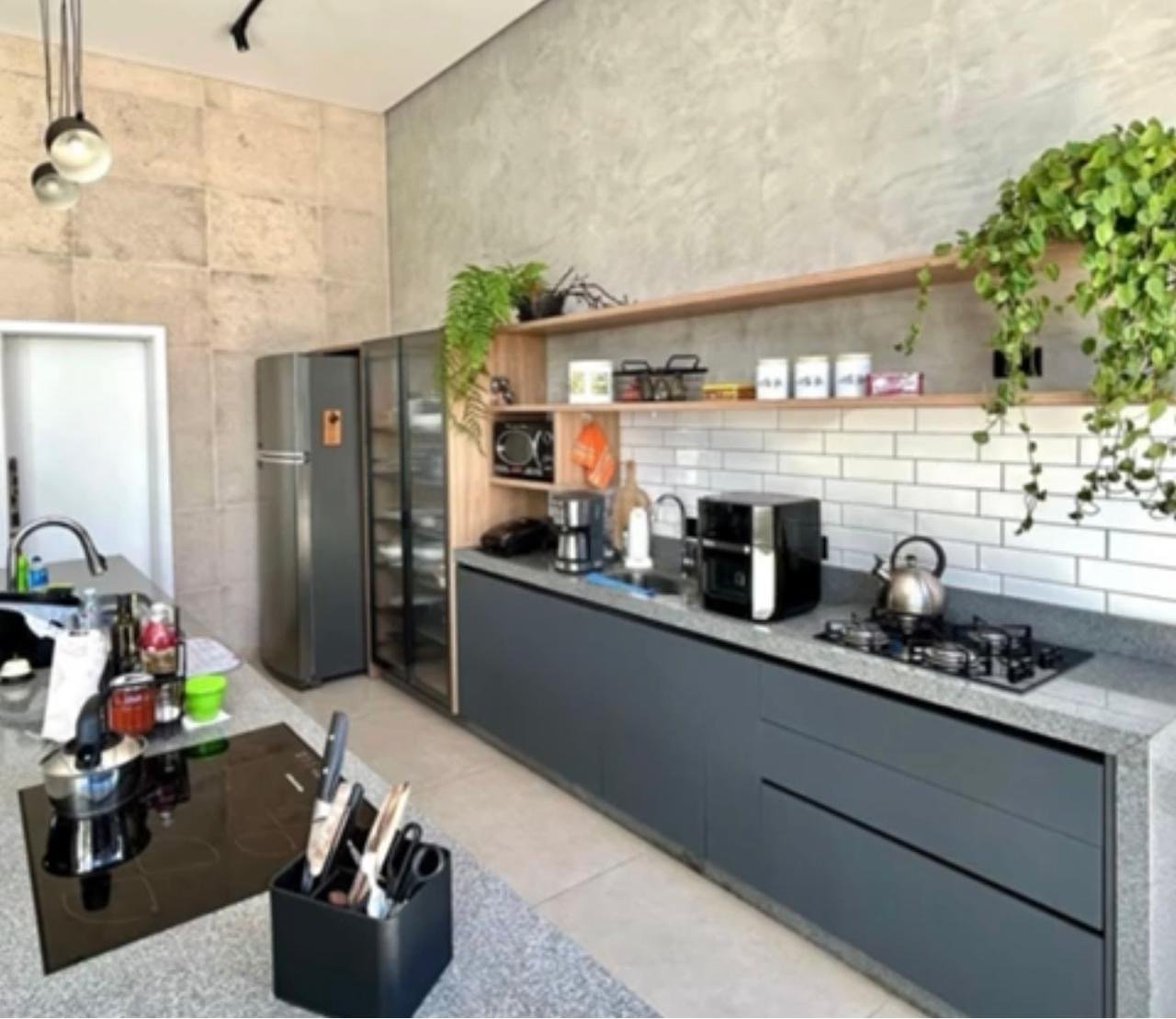 Cozinha planejada com ilha equipada com lava louças, cooktop de indução e a gás